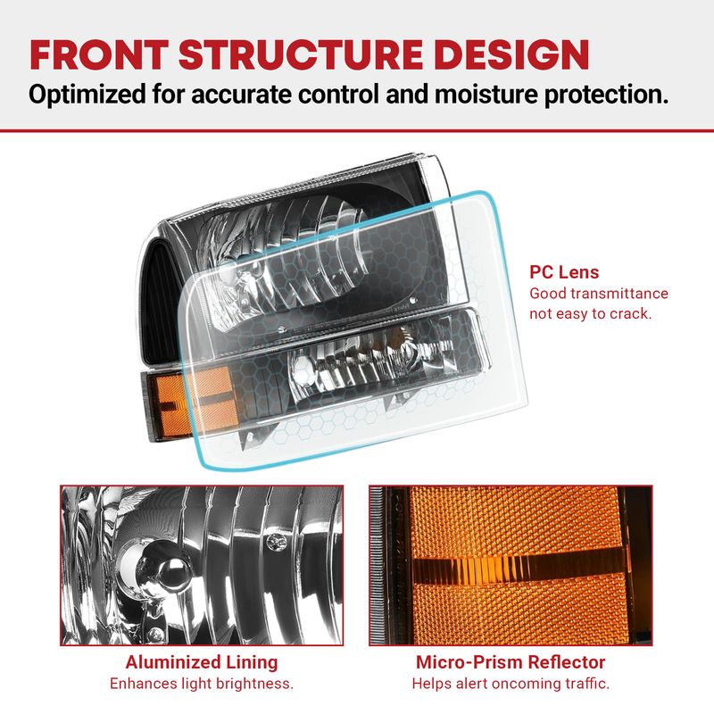 The superior lens features good transmission, high toughness, and excellent UV resistance to prevent yellowing & cracking; and the upgraded housing is shock-proof and heat-proof for better durability than other headlights.