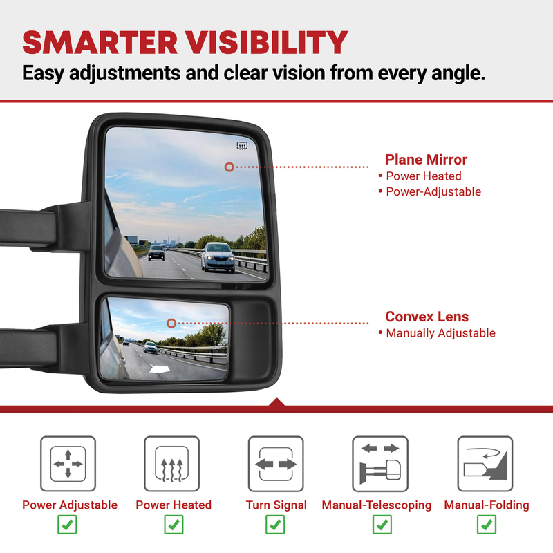 Functions: featuring power adjustable & power heated plane mirror, manually adjustable convex lens, amber turn signal indicators, manual telescoping & folding, the multifunctional side mirrors can strikingly enhance your driving experience