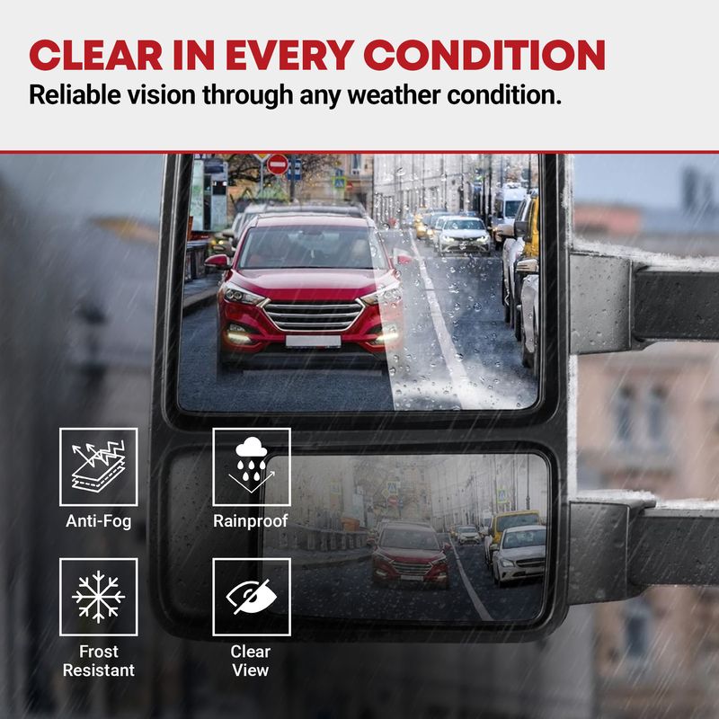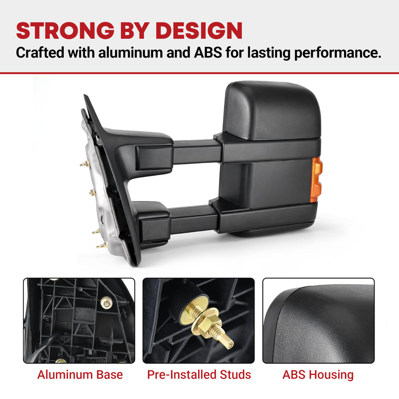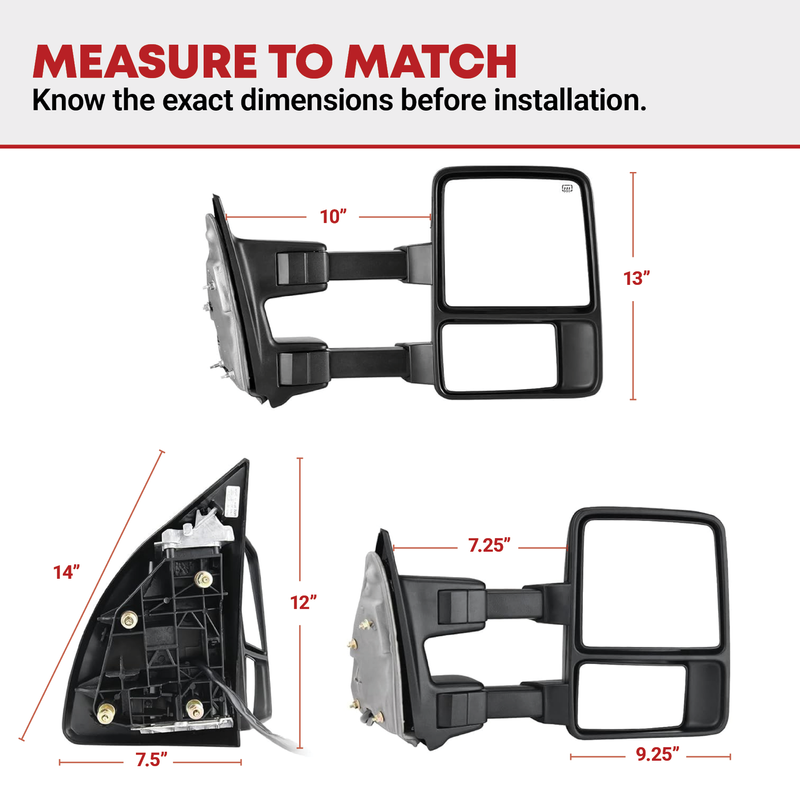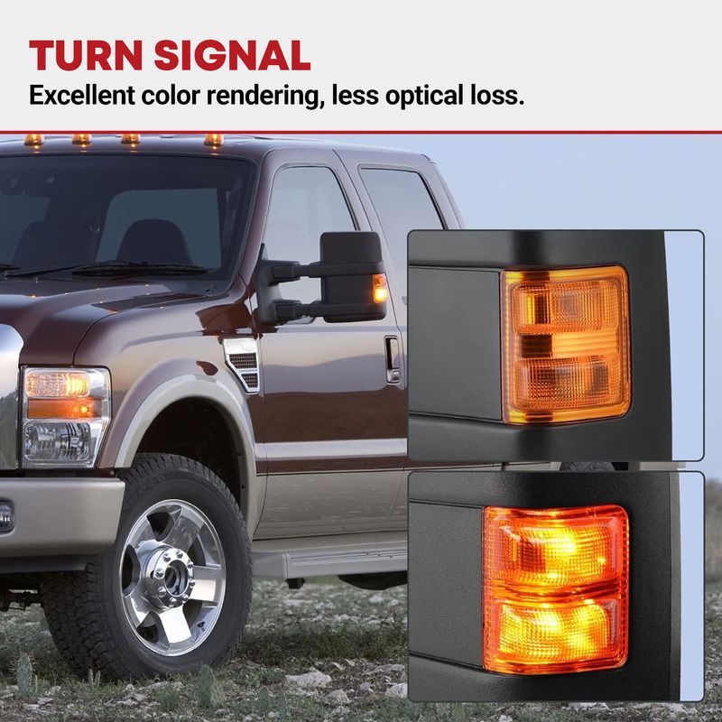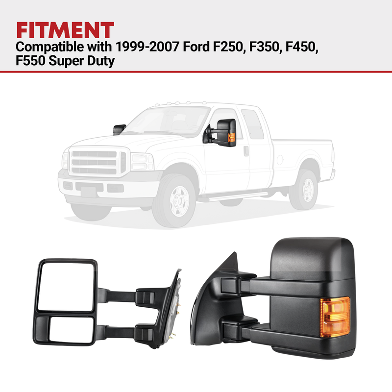 These YITAMOTOR Towing mirrors perfectly fit for 1999-2007 F250 F350 F450 F550 Super Duty, to replace the factory mirrors. They make perfect replacements with great upgrades that have good cost savings over the dealer parts.