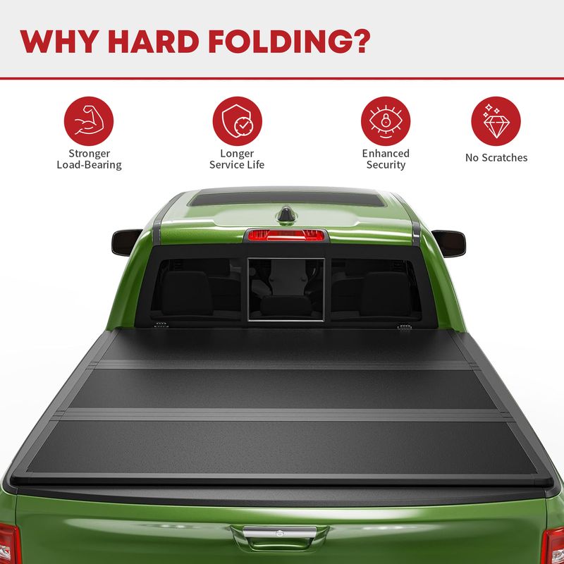 No-drill Installation: Install the hard tri-fold tonneau cover in no time without any drilling or modifications needed; Comes with detailed instructions for added convenience; Note that if your truck has cargo racks, remove them before installing this cover