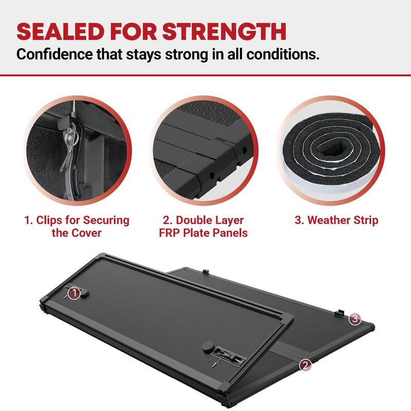 Element-Proof Cargo Cover: Crafted with high-quality Fiberglass Reinforced Polymer (FRP) sheet, our truck bed tonneau cover offers reliable scratch resistance and protection against different weather elements including rain, snow, dirt, and UV rays. Enjoy reliable durability without fading, cracking, or flaking