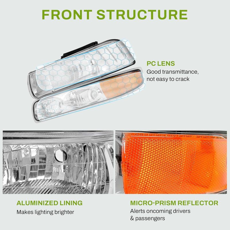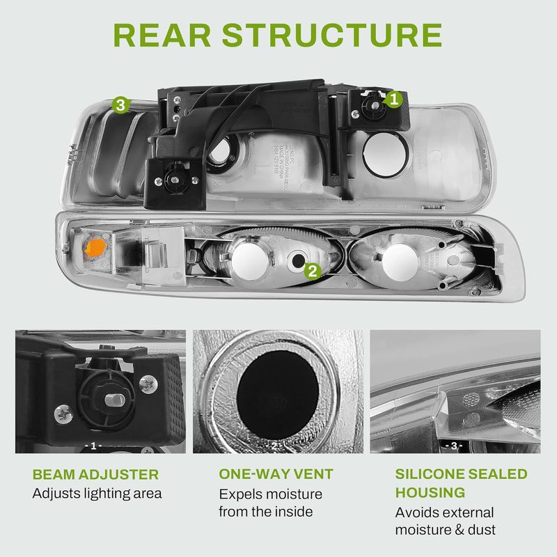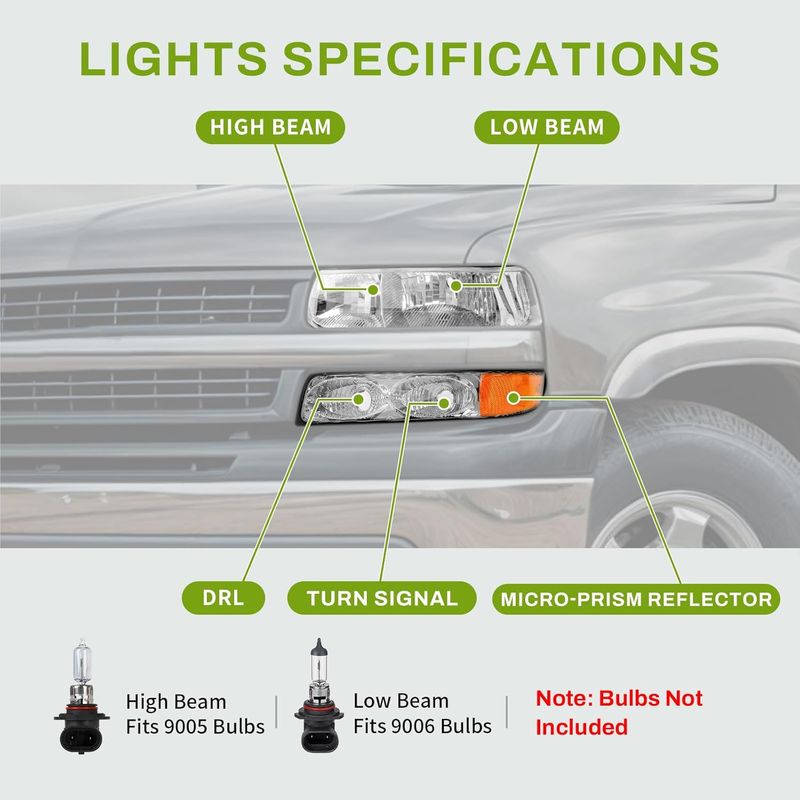 Vehicle compatibility: the headlights assembly is compatible with 1999 2000 2001 2002 Chevy Silverado 1500 2500; high beam bulb type: HB3/9005; low beam bulb type: HB4/9006; bulbs are not included