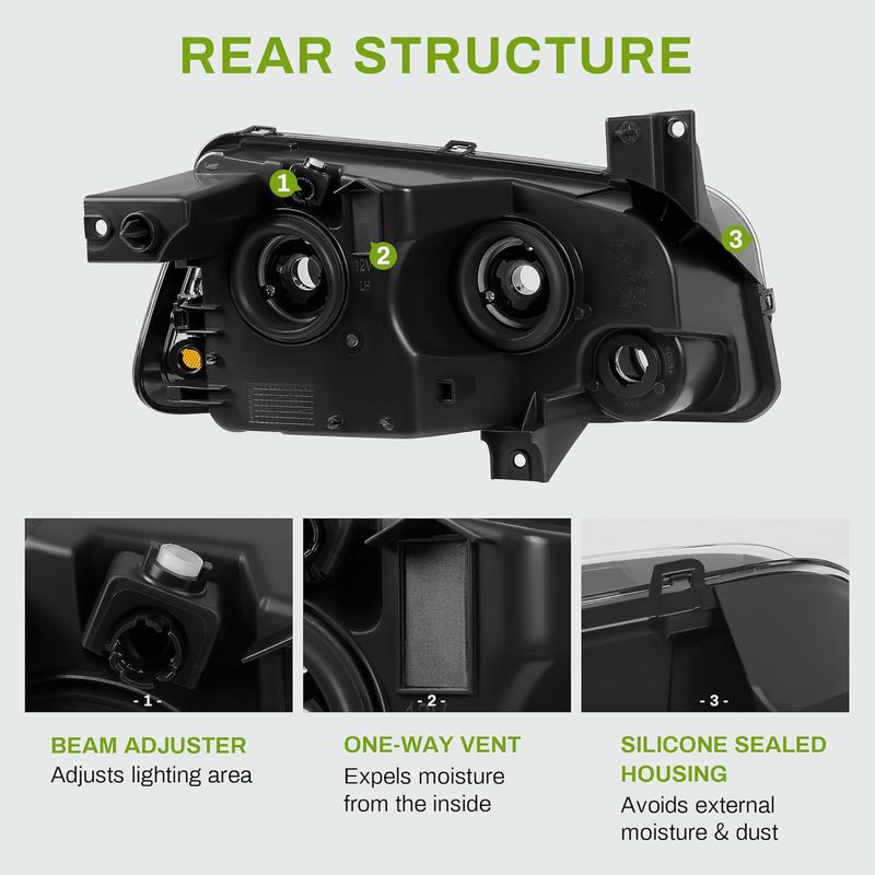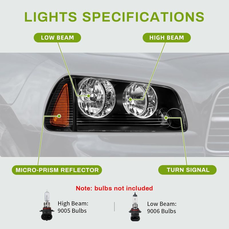 Vehicle compatibility: headlights assembly compatible with 2006 2007 2008 2009 2010 Dodge Charger; high beam bulb type: HB3/9005; low beam bulb type: HB4/9006; bulbs are not included