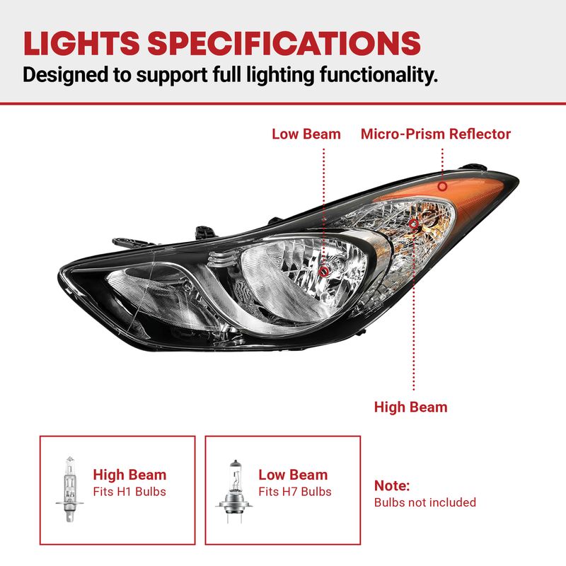 Compatibility: the headlight assemblies are compatible with 2011 2012 2013 Elantra; low beam:H7, highbeam H1; bulbs are not included