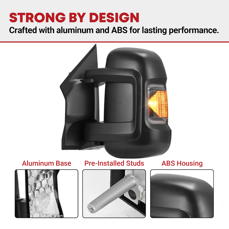 The towing mirrors feature a classic triangle construction, durable aluminum base, and pre-installed studs for a stable installation on your vehicle.