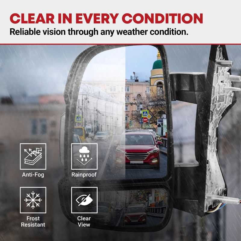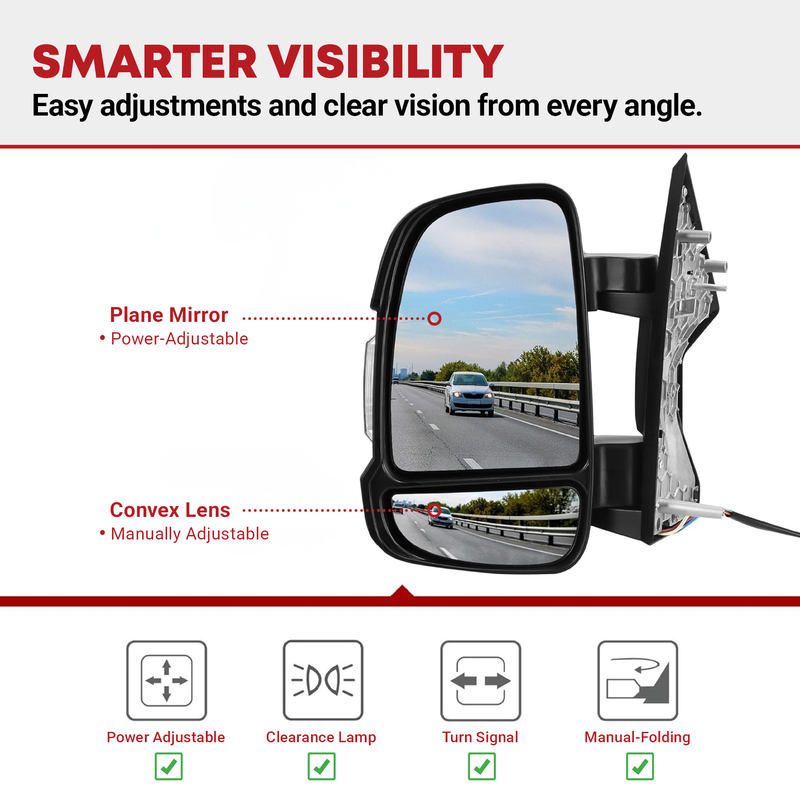 Functions: featuring power adjustable and power heated plane mirror, the manually adjustable convex lens, LED signal lights, manual folding, temperature sensor, helping you keep a watchful eye on your surroundings
