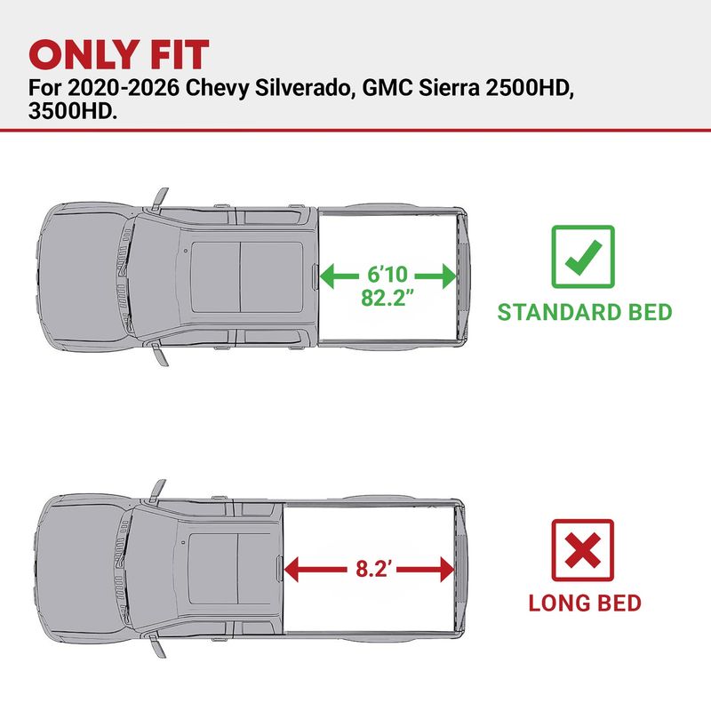 Precision Fit: This tonneau cover is designed for 2020 2021 2022 2023 2024 2025 2026 Chevy Silverado 2500HD 3500HD and GMC Sierra 2500HD 3500HD with 6.9 ft beds w/o Multi-flex tailgate and Carbonpro Bed; It ensures a snug fit and dependable coverage whether you're tackling daily jobs or weekend getaways