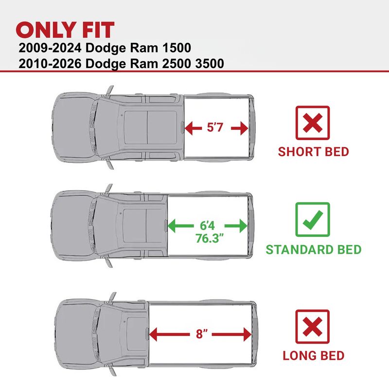 Precision Fit: This tonneau cover is designed for Dodge Ram 1500 2009-2024 (19-24 Classic),Dodge Ram 2500 3500 2010-2026 with 6.4 ft beds w/o Rambox and Split Tailgate; It ensures a snug fit and dependable coverage whether you're tackling daily jobs or weekend getaways