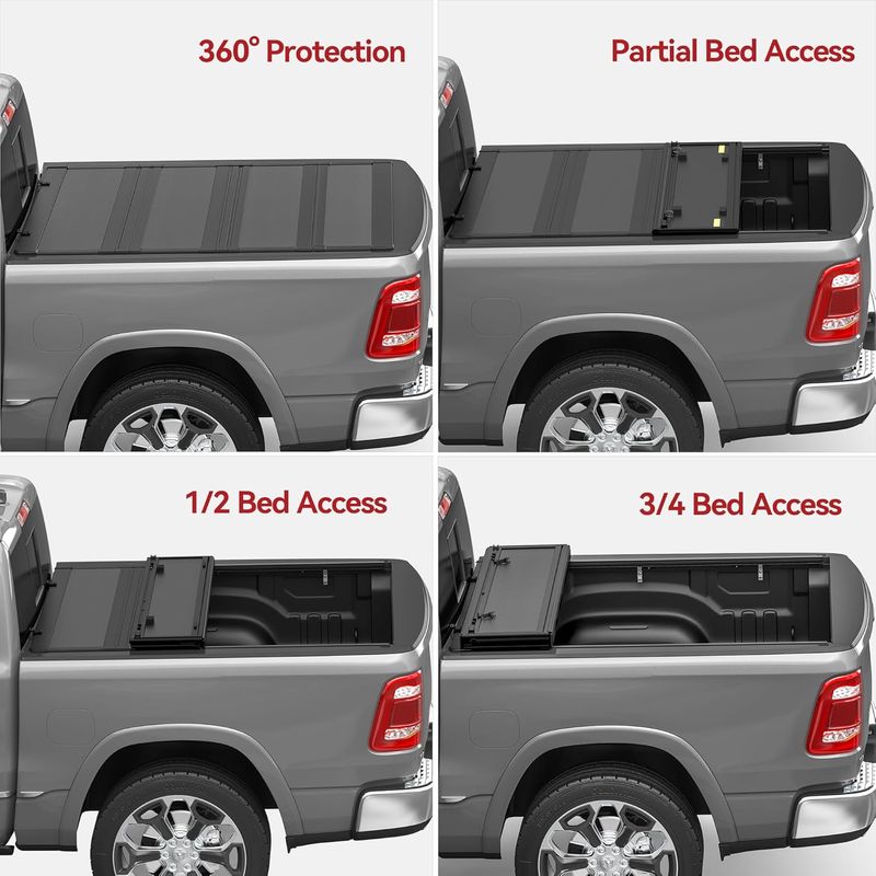 Functional Quad-Fold Design: More flexible than traditional tri-fold covers, this hard quad-fold design allows up to 3/4 access to your truck bed; It is ideal for hauling bulky tools and outdoor gear