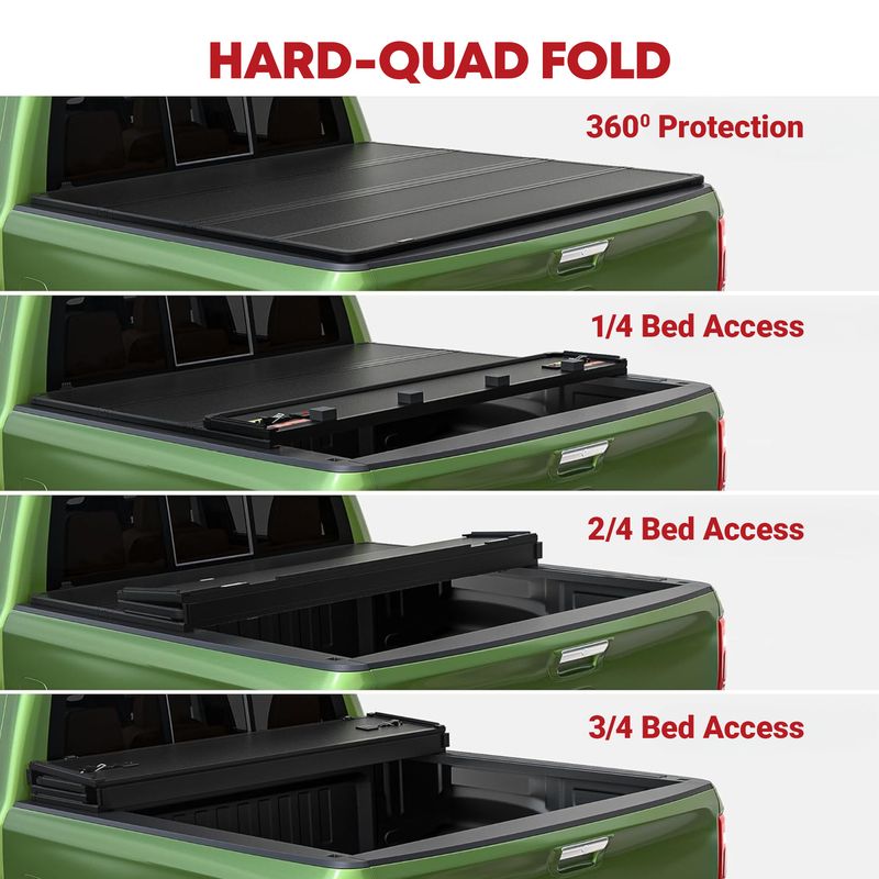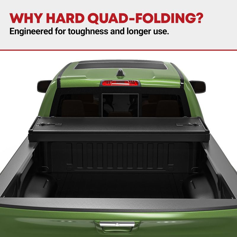 Space-Saving Design: Unlike bulky alternatives, this pickup bed cover's quad-fold design offers a space-saving solution for your truck bed; Quickly access your gear by folding up the cover without losing valuable space