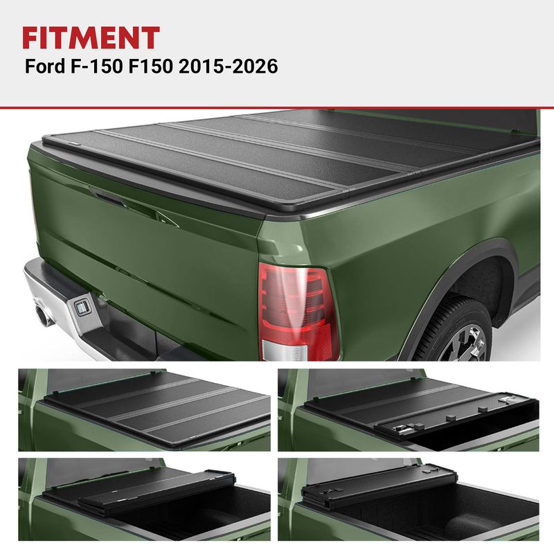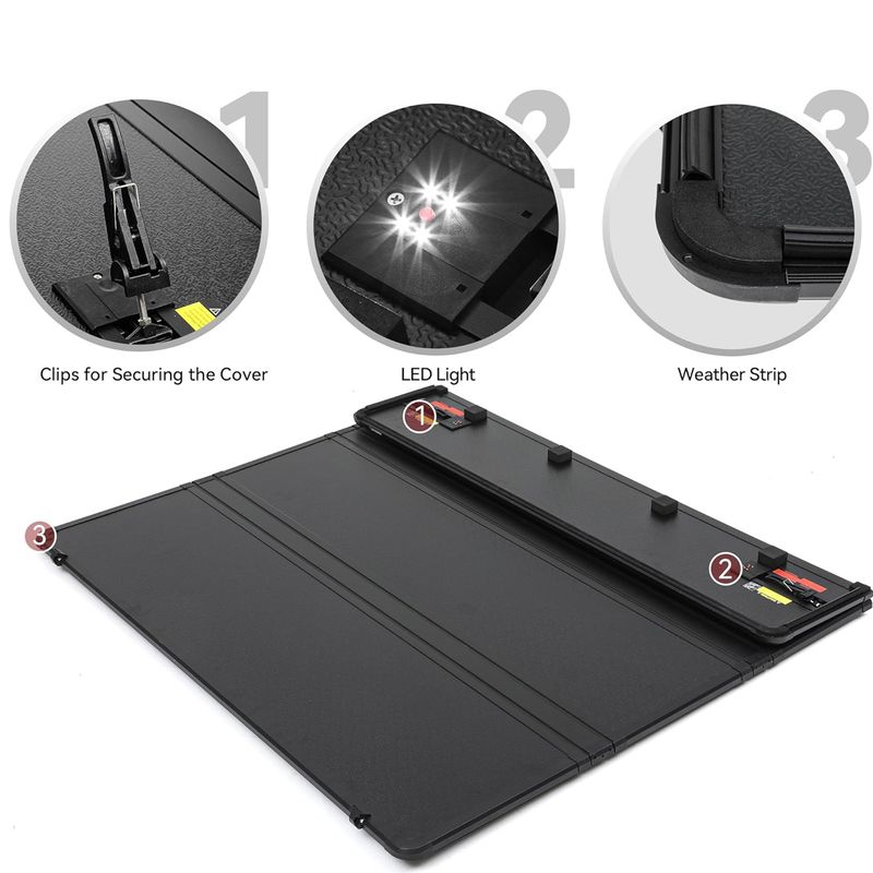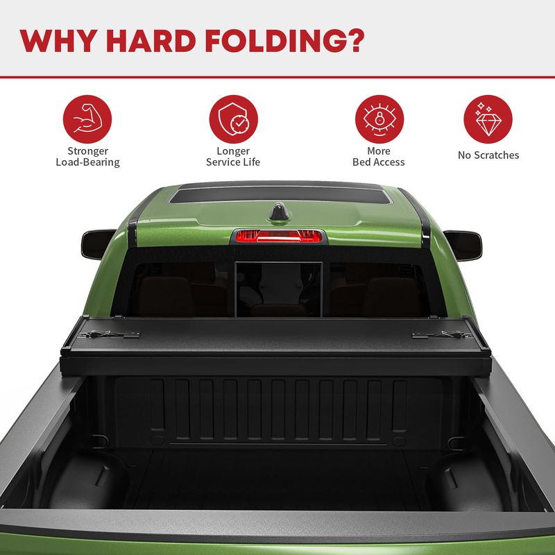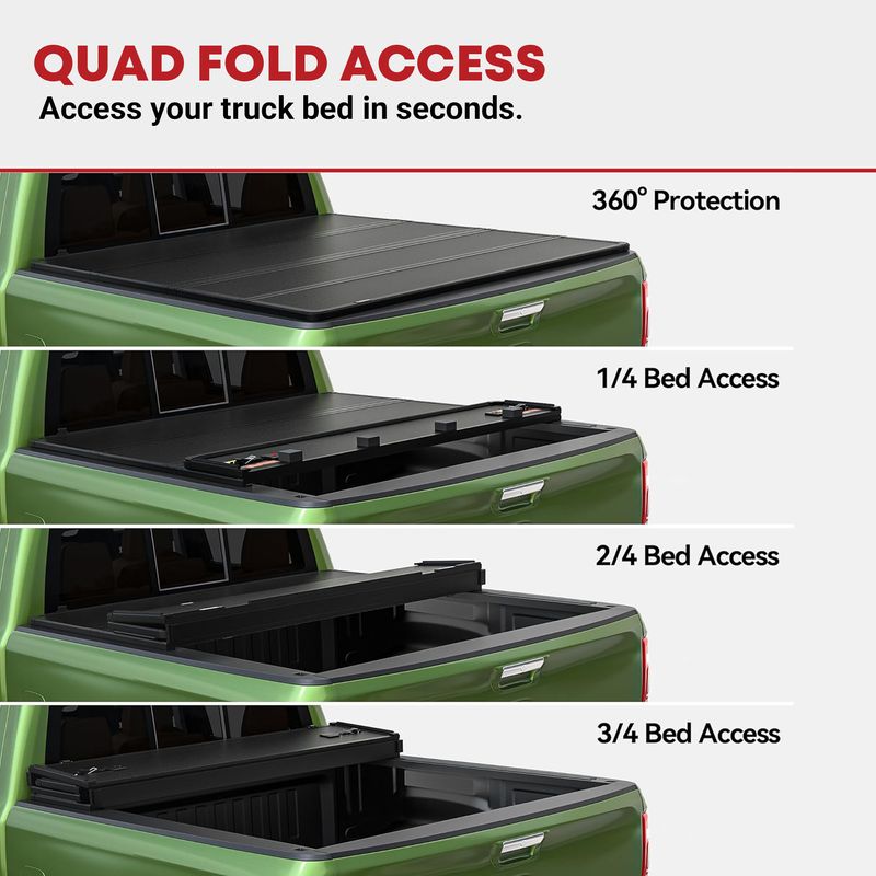 Space-Saving Design: Unlike bulky alternatives, this pickup bed cover's quad-fold design offers a space-saving solution for your truck bed; Quickly access your gear by folding up the cover without losing valuable space