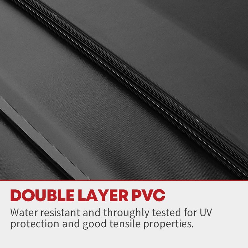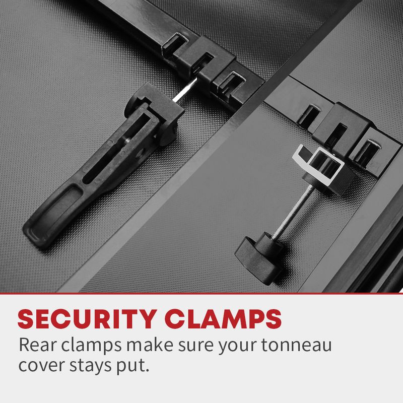 The cover is dual-coated and made out of heavy-duty high-grade vinyl, with built-in horizontal crossbars that offer support when the cover is lying flat; and roll up with the tarp to provide full bed access when in need. Also comes with high-grade aluminum side rails-, and aluminum clamps for mounting to the truck bed.