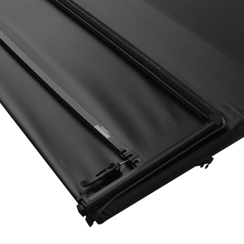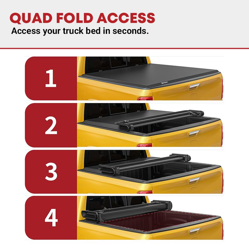 Why Quad Fold: More access room when folded up, more durable with one more cross bar and two more firm clamps than trifold cover.