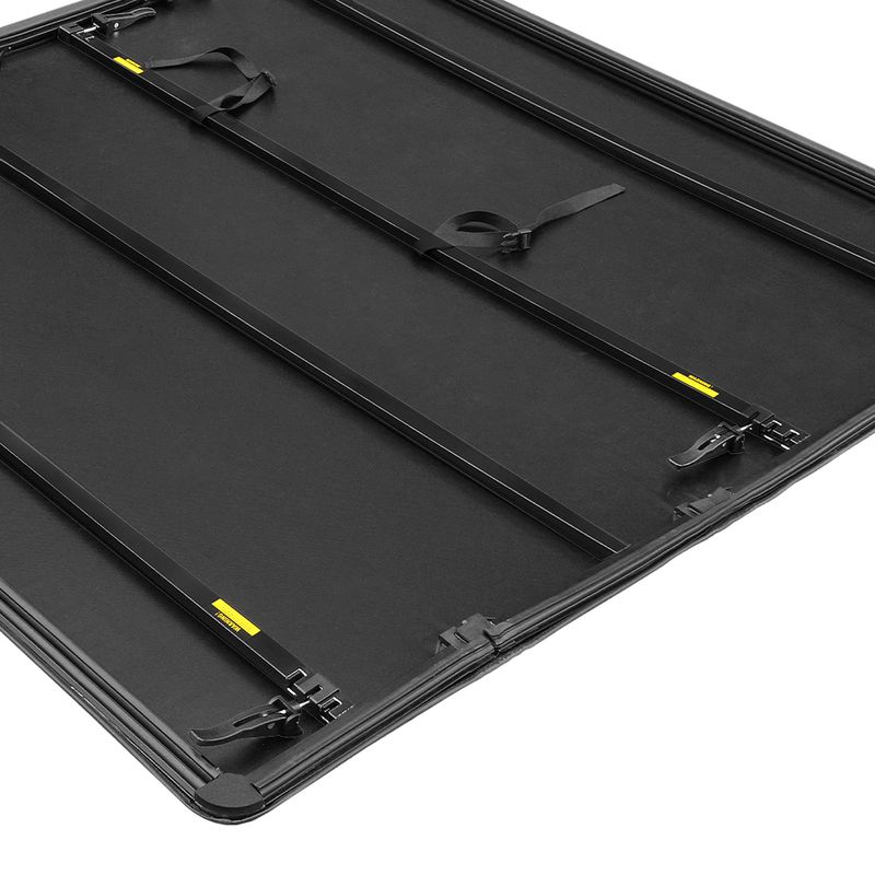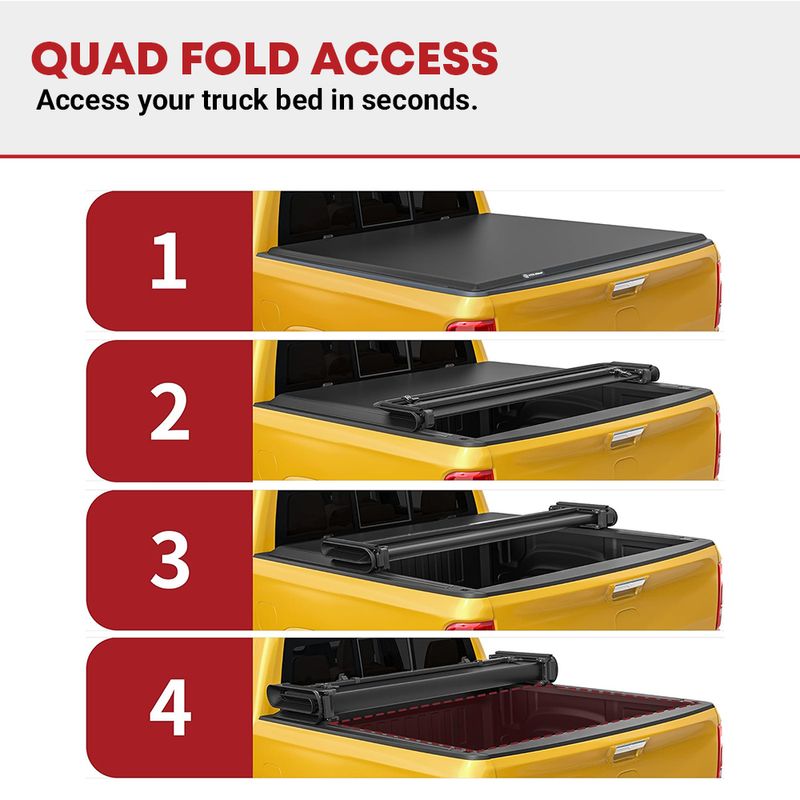 Why Quad Fold: More access room when folded up, more durable with one more cross bar and two more firm clamps than trifold cover.