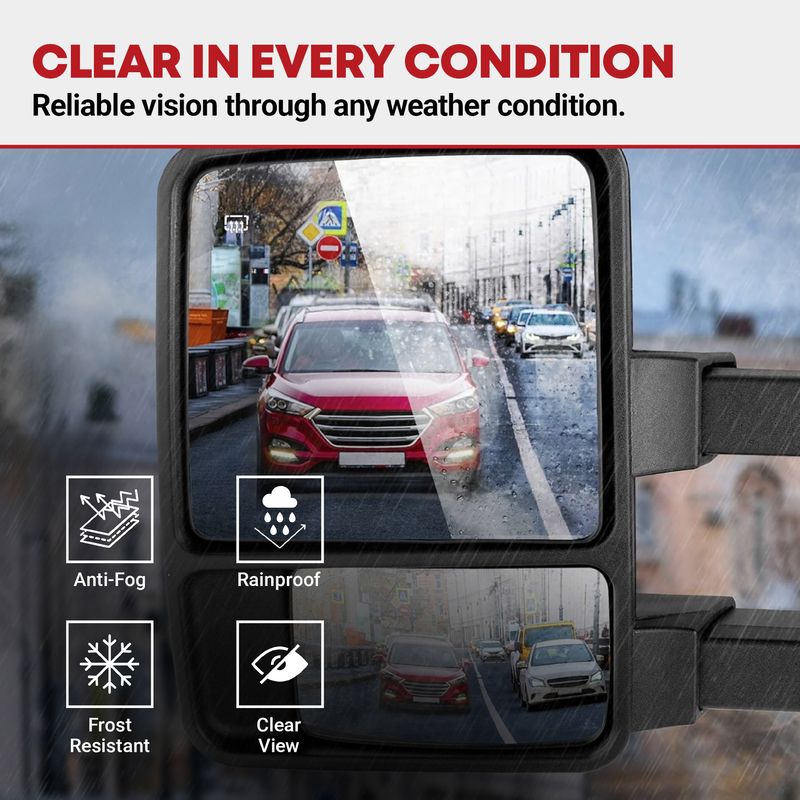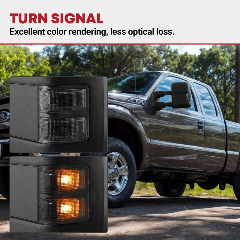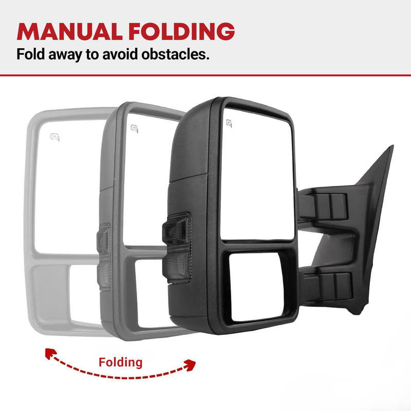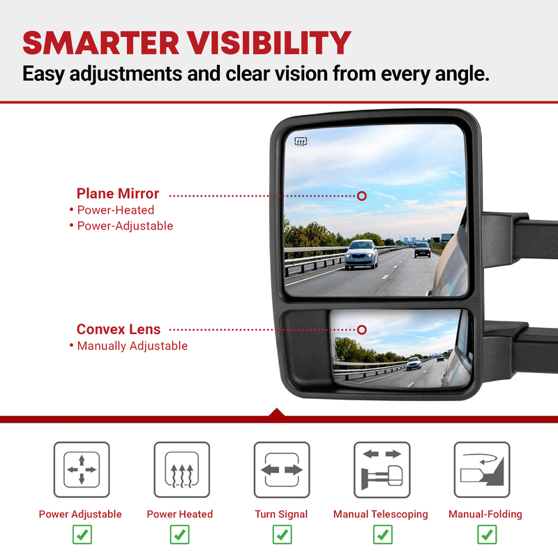Functions: featuring power adjustable & power heated plane mirror, manually adjustable convex lens, rear LED turn signal, manual telescoping & manual folding, the multifunctional side mirrors can strikingly enhance your driving experience