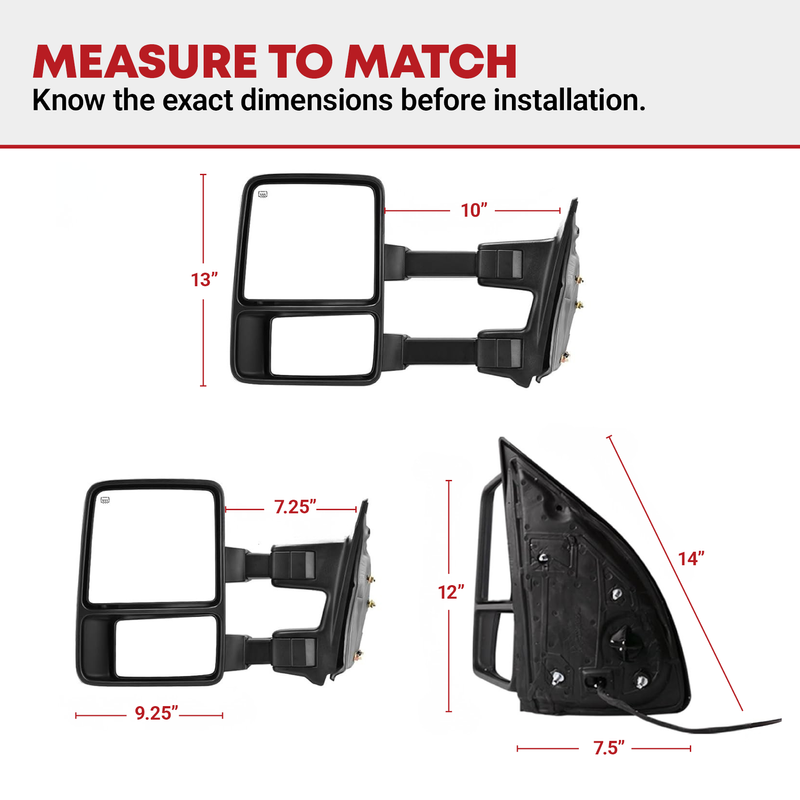 You get a great upgraded towing mirror that meets the same standards set for factory mirrors and they mount in the same location for easy installation.