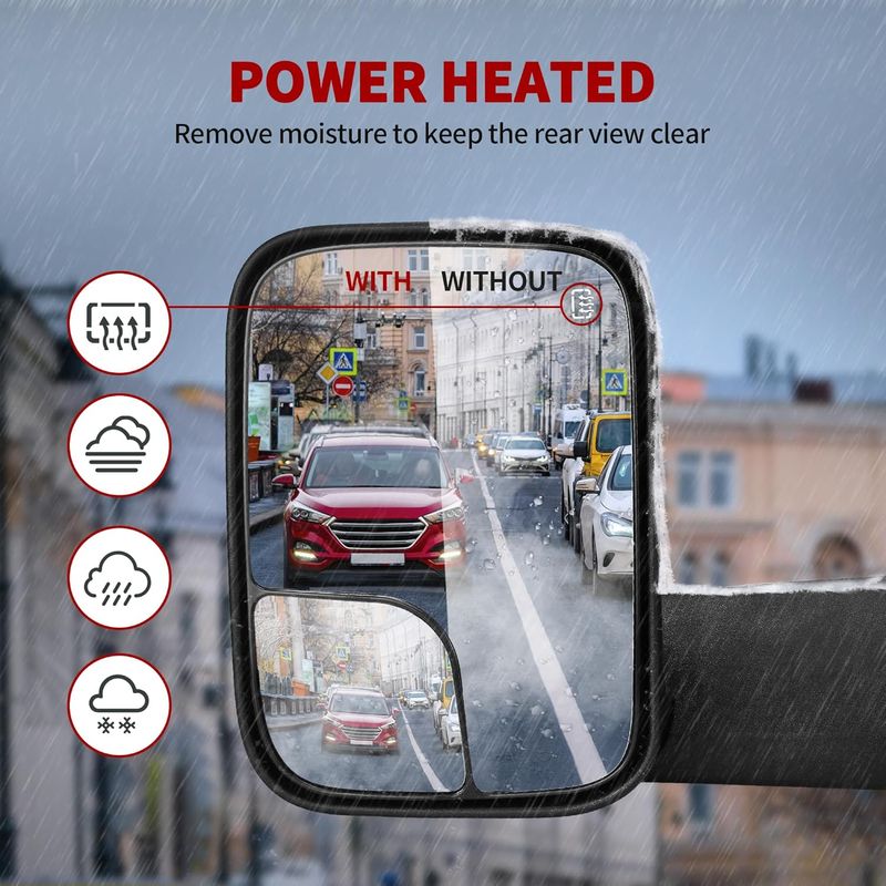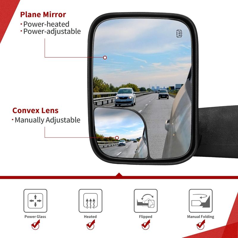 Functions: featuring power adjustable & power heated plane mirror, manually adjustable convex lens, manual flipping & manual folding, helping you keep a watchful eye on your surroundings