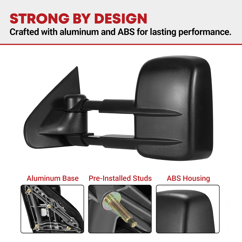 The towing mirrors feature a classic triangle construction, durable aluminum base, and pre-installed studs for a stable installation on your vehicle.