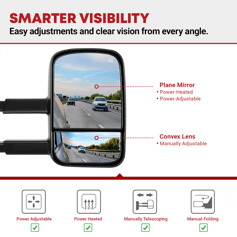 Functions: featuring power adjustable plane mirror, manually adjustable convex lens, manual telescoping & manual folding, helping you keep a watchful eye on your surroundings