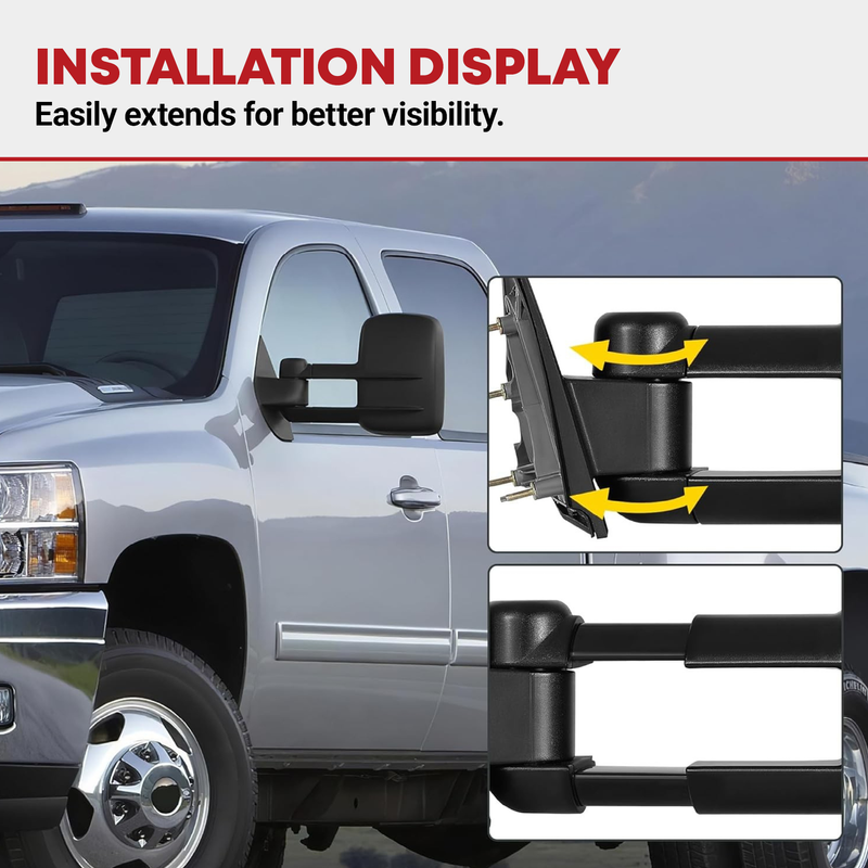 Easy to install: just simply connect the plugs of the trailer towing mirror to the corresponding power cord, no drilling or modifications are required(professional installation would be highly recommended)