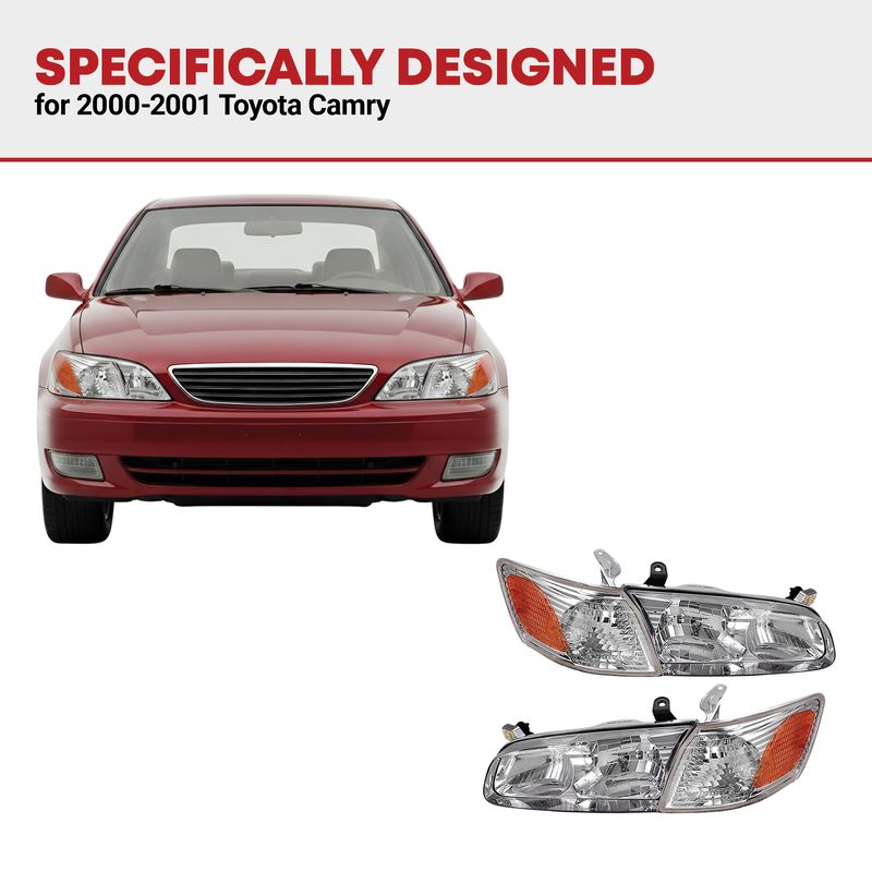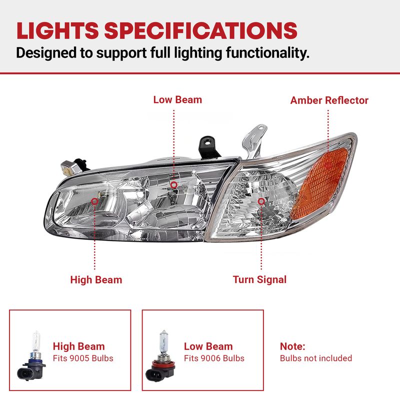 Compatibility: the headlight assemblies are compatible with 2000-2001 Camry; high beam mode 9005 and low beam mode 9006; bulbs are not included