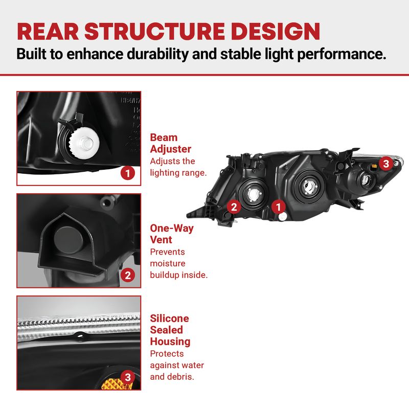 Factory-style headlights are identical to the original unit in every way— the same quality and the same method of installation. And every headlight assembly undergoes strict testing before it leaves the factory. All wiring is rigorously tested to ensure the light is completely functional. A new pair of headlights can provide you with up to 50% more illumination than dull, yellowed, sandblasted, broken, or scratched headlights.