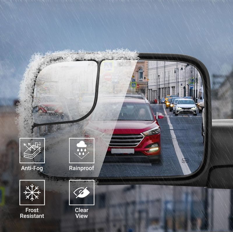 The upper plane glass of these mirrors is heated for defogging and defrosting. It can defog and defrost by itself, super convenient for you on a rainy or foggy day.