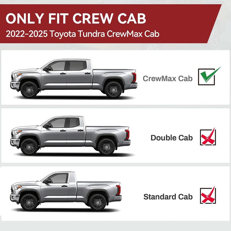 Compatibility: YITAMOTOR two raised step running boards fit 2022-2025 Toyota Tundra Crewmax Cab. Please check the cab size picture if you're unsure about your exact model