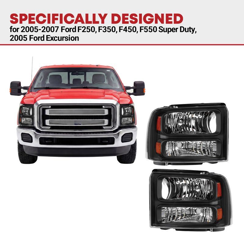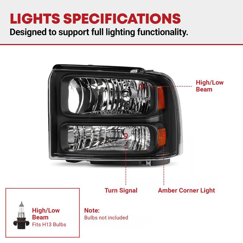 • Compatibility: the headlight assemblies are compatible with 2005-2007 Ford F-250 F-350 F-450 F-550 Super Duty / 2005 Ford Excursion US models only; Not fit with Sealed Beam Headlight model; high/low beam: H13; bulbs are not included